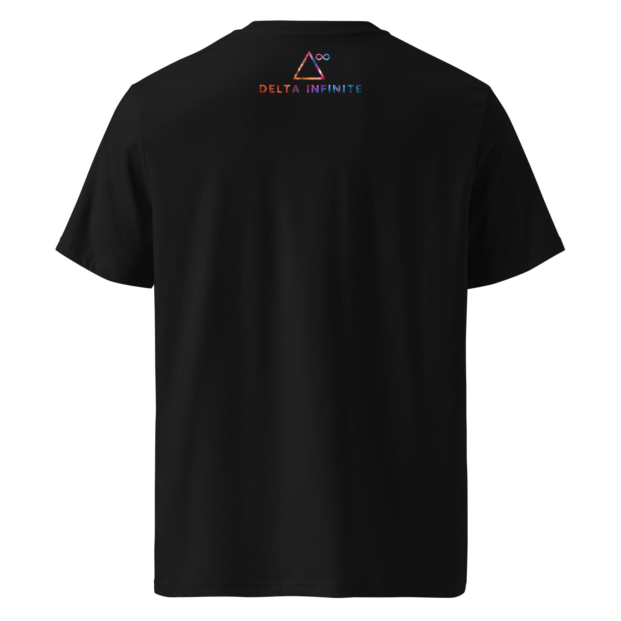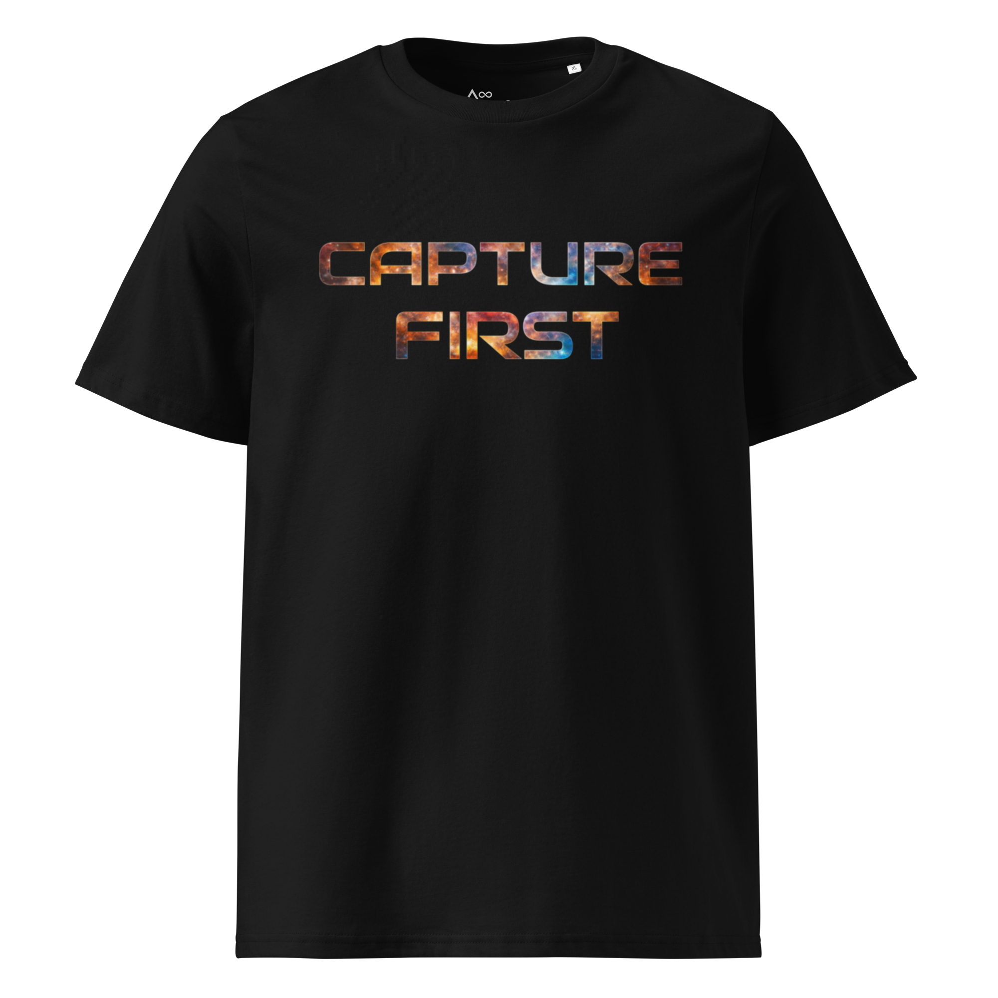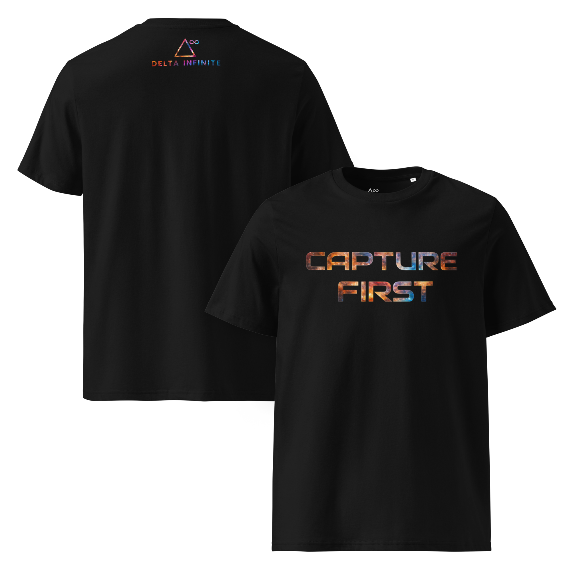 The front reads CAPTURE FIRST in a technical typeface. The back carries the Delta Infinite mark. Inside the collar, a printed label records Drop – 001.