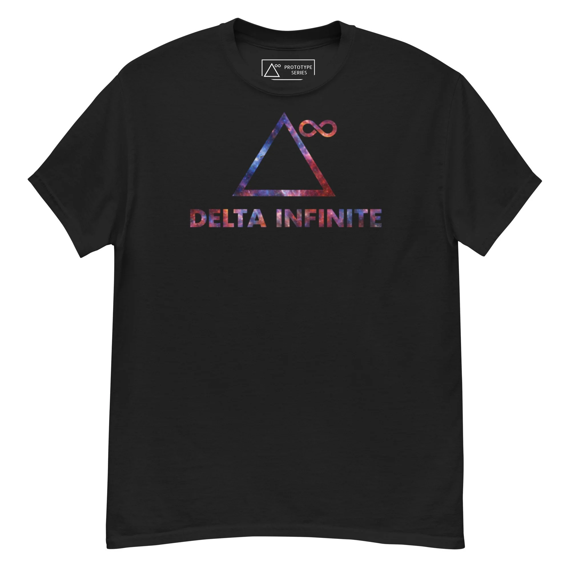 This version is built on a unisex tee base for easy, repeat use. The front carries the Delta Infinite mark. Inside the collar, a custom printed label records PROTOTYPE SERIES, preserving a quiet link to the line’s origin.